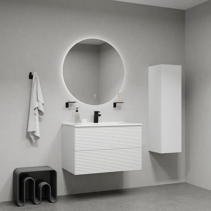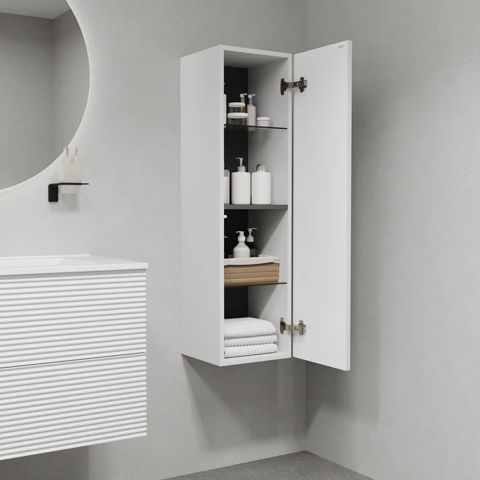 Подвесной пенал для ванной комнаты Bild – красивый дизайн с вертикальной фрезеровкой в сочетании с классическим белым цветом, удобством и практичностью. Универсальная ориентация: пенал можно подвесить так, чтобы дверки открывались в удобную вам сторону (пенал можно перевернуть на 180 градусов, при этом перевешивать дверцы не нужно).
