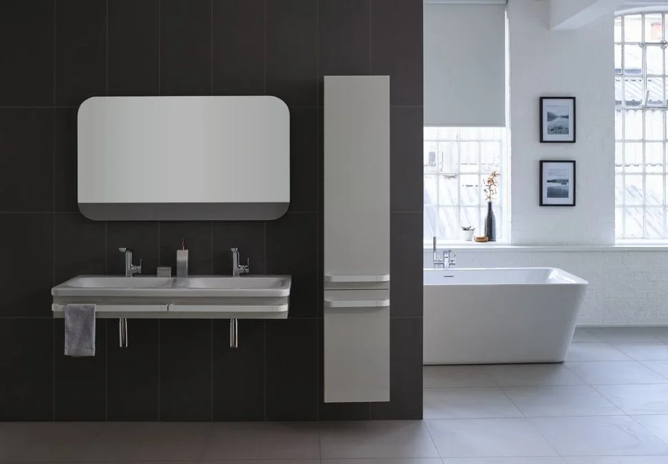 TONIC II Узкий пенал (ширина 35 см), 2 дверцы, система плавного закрытия, для подвесного монтажа. В комплекте: крепеж, 3 стеклянные полки в верхней части, 1 стеклянная полка в нижней части. Правая версия. Ручки в комплект не включены