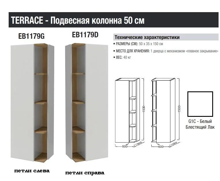 Terrace 50х35х150см, пенал, правый, подвесной монтаж, белый блестящий лак, арт. EB1740DRU-G1C, Jacob Delafon