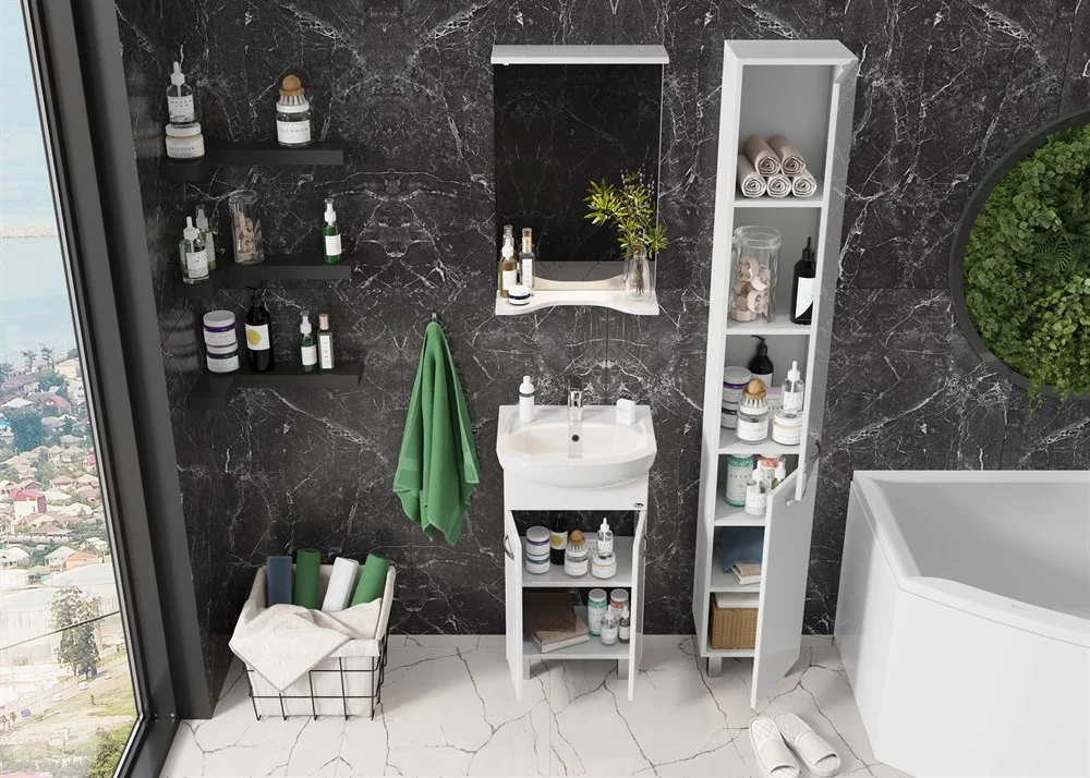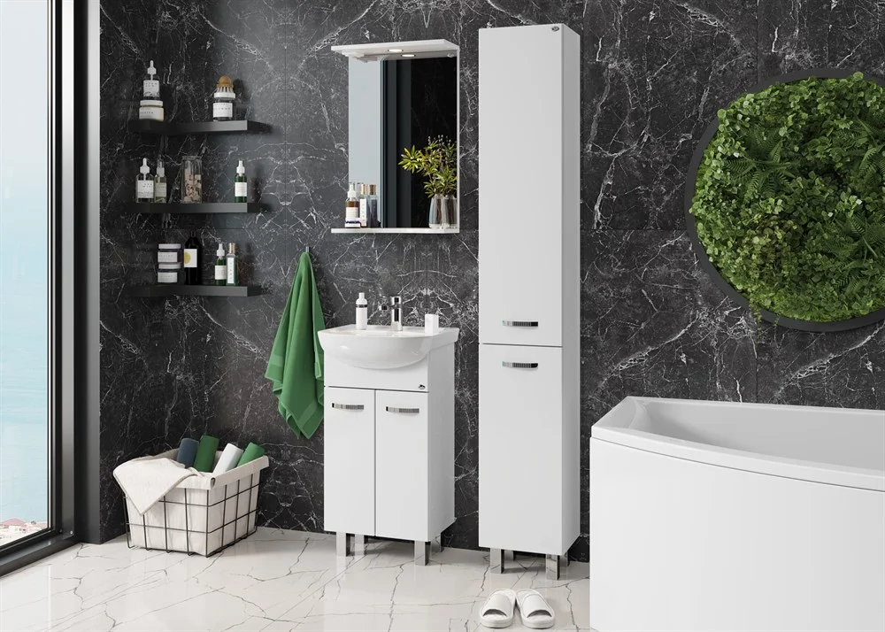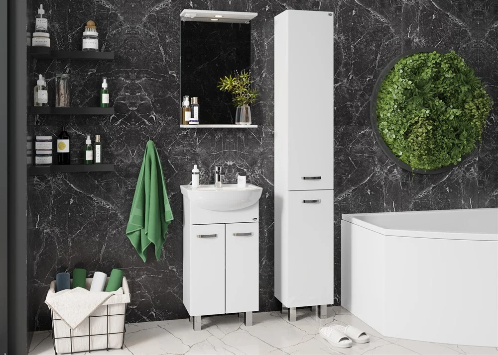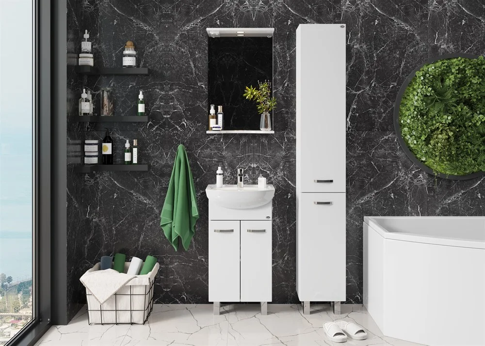 Корпус Шкаф-пенала выполнен из ЛДСП, фасад - из МДФ в пленке, специально предназначенных для использования в условиях высокой влажности.