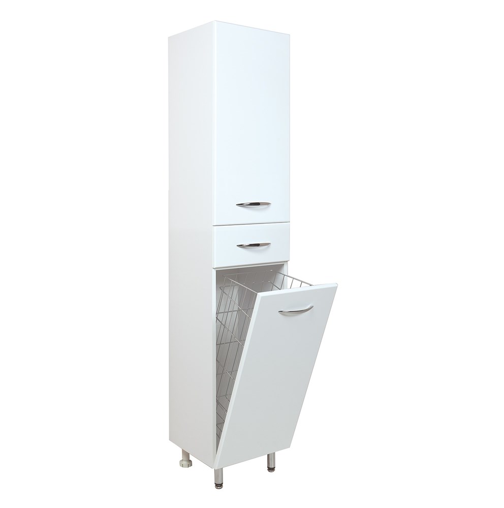 Большое отделение сверху за распашной дверцей с механизмом плавного закрывания, небольшой ящик с направляющими полного выдвижения посередине и отделение с корзиной для белья внизу шкафа обеспечит бережное хранение всех необходимых в ванной комнате вещей.
