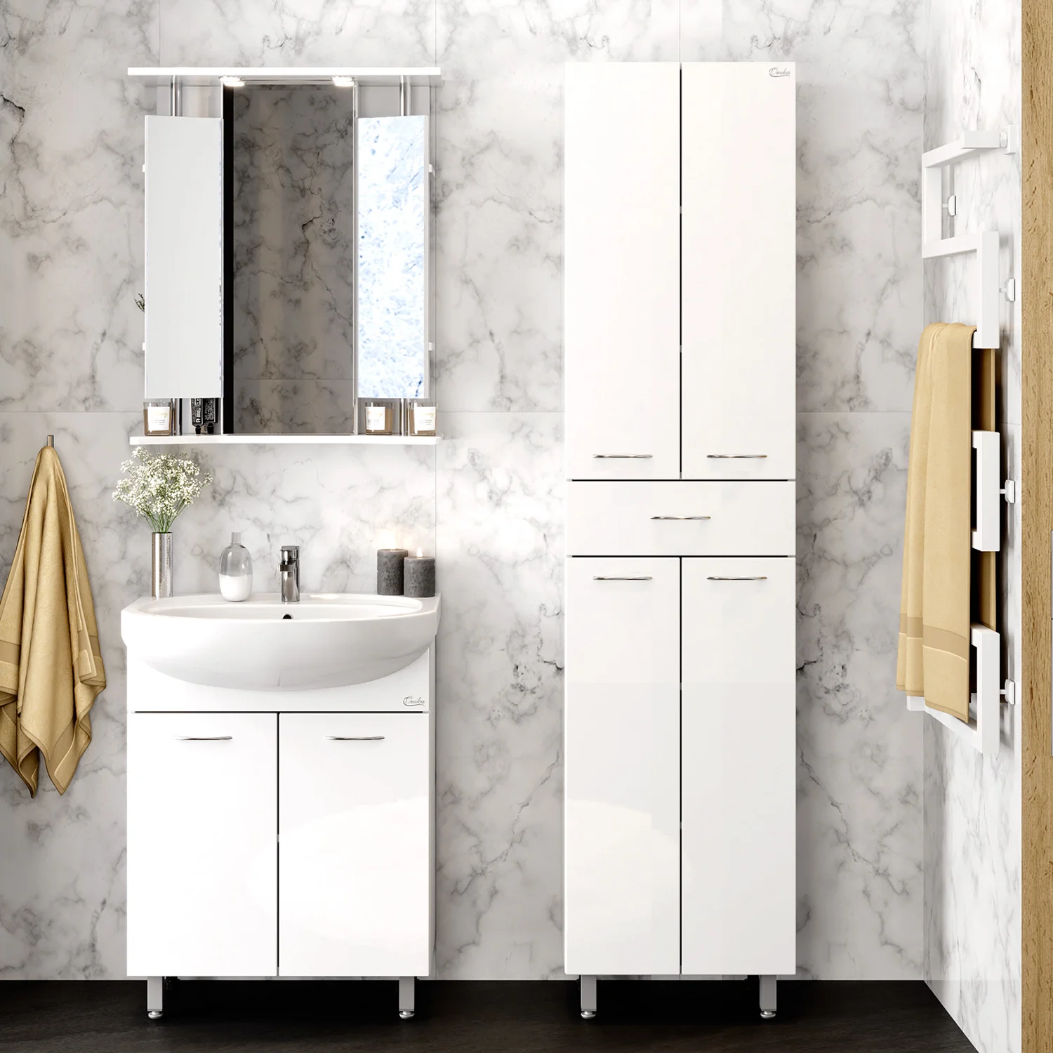 Корпус пенала выполнен из ЛДСП, фасад - из МДФ в пленке, устойчивых к механическим воздействиям, перепадам температур и высокой влажности.
