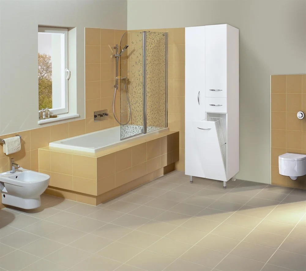 Конструкция Шкаф-пенала предусмотрела огромное пространство для хранения, в котором поместятся все необходимые вещи: слева - большое отделение сверху, небольшой выдвижной ящик посередине и отделение с корзиной для белья снизу , справа - место для хранения халатов. Дверцы оснащены механизмом плавного закрывания, а ящик - направляющими полного выдвижения.