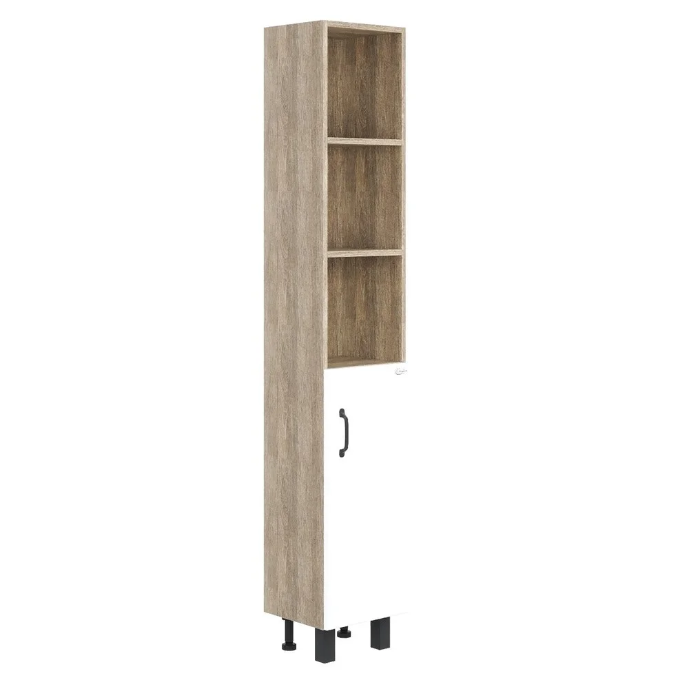 В Шкаф-пенале Onika ТИМБЕР 60.01 удачно сочетаются контрастные цвета и фактуры: белый матовый фасад с покрытием SoftTouch, корпус цвета дуба с роскошной текстурой, черная матовая металлическая фурнитура.