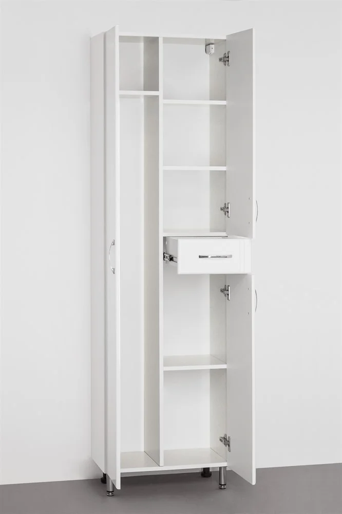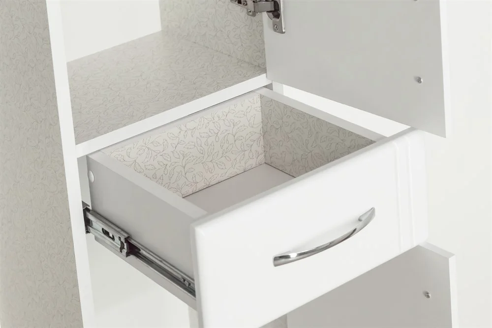 Колонна напольная бренда "Style Line" Эко Стандарт 54. Фурнитура - хром, эксклюзивный декор "Луино" - ламинация внутренней стороны изделия. Направляющие полного выдвижения Hettich; сборка изделия с помощью эксцентриковых стяжек Hafele; все материалы полностью влагостойкие