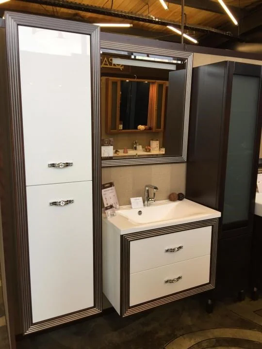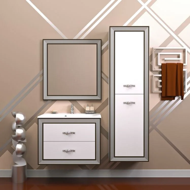 Мебель изготавливается из высококачественного МДФ, окрашенного глянцевыми эмалями бежевого и белого цветов и массива дерева в сочетании с золотой и серебряной патиной. Комплект состоит из зеркала в деревянной раме с подсветкой, тумбы с современной раковиной из литьевого мрамора и европейской фурнитуры.