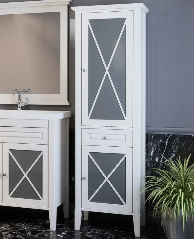 Коллекцию прекрасно дополняет высокий напольный пенал с дверцами с матовым стеклом и выдвижным ящиком.