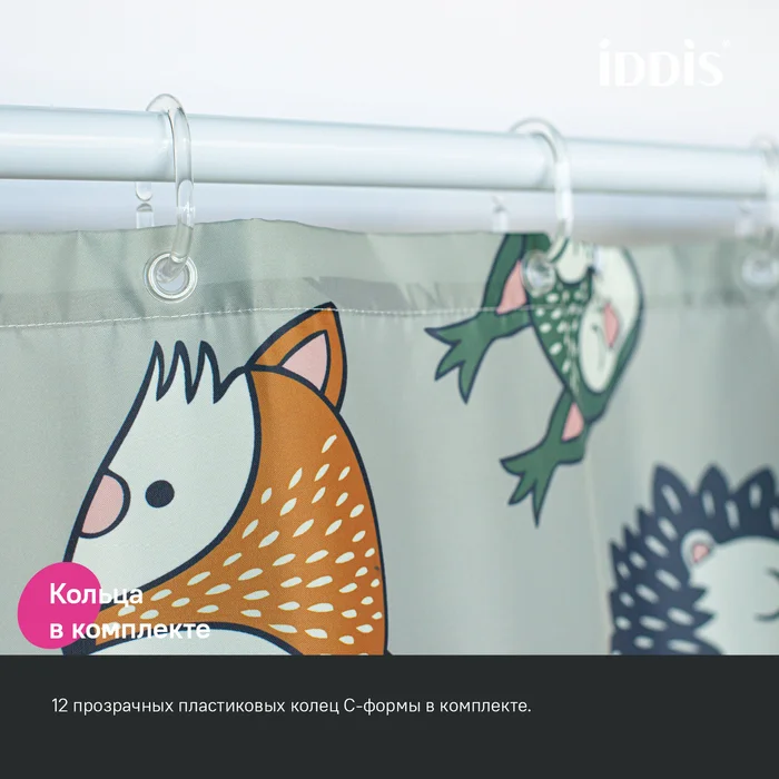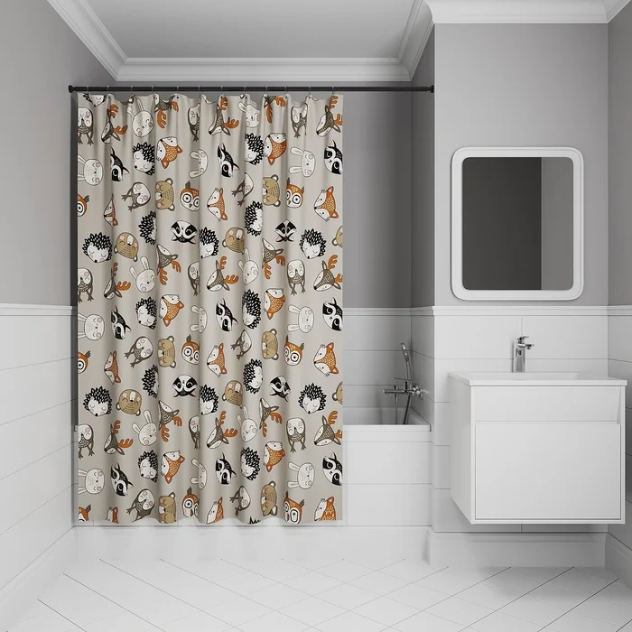 Текстильная Штора для ванны светло-серого цвета с милым принтом в виде мордочек лесных зверей. Идеально подойдет для детской или семейной ванной комнаты.