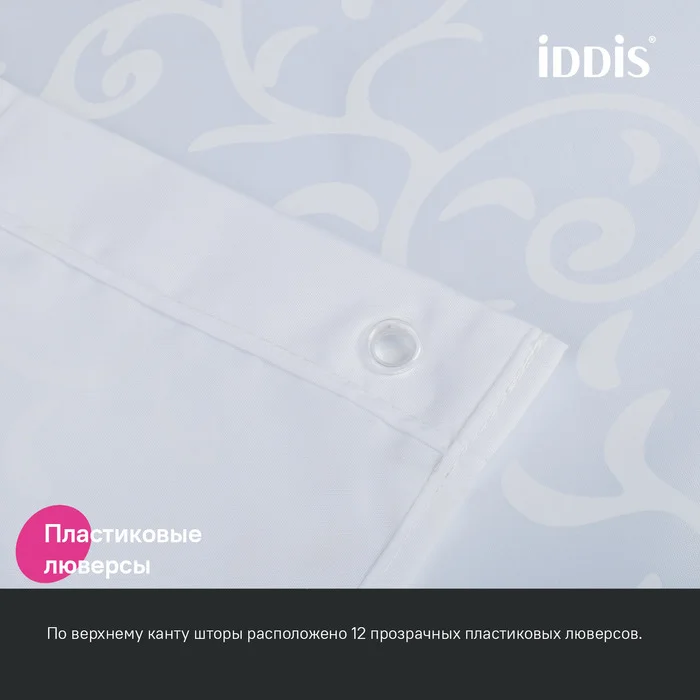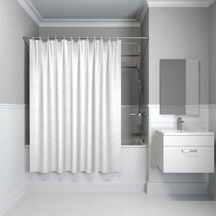 Текстильная Штора для ванны белого цвета с ненавязчивым узором гармонично впишется в классический и современный интерьер.