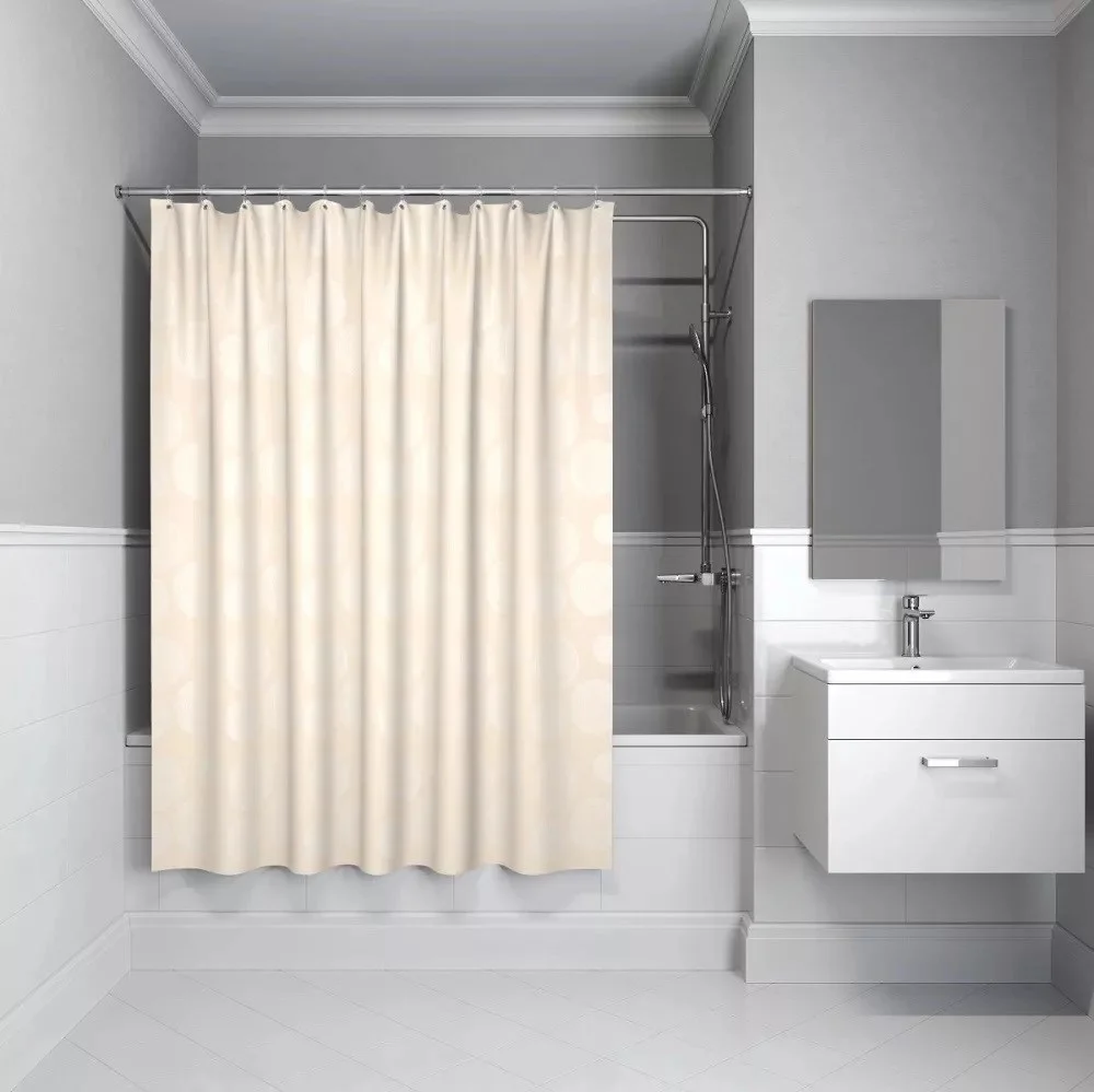 Штора для ванной комнаты, коллекция Basic, 100% Полиэстер; плотность - 80 гр/м2; размер - 180*180 см. Водозащитное покрытие; без колец в комплекте. Материал люверсов - Пластик прозрачный. Упаковка - ПВХ пакет.