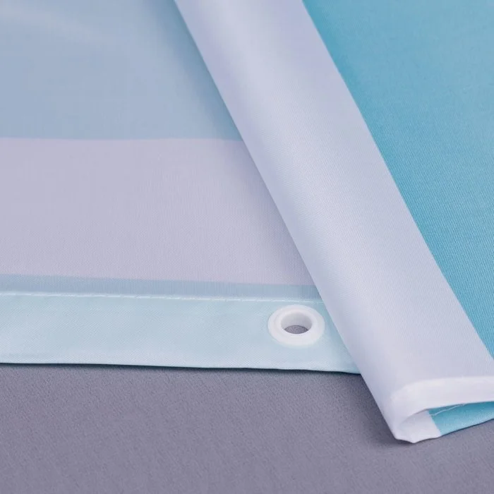 100% Полиэстер, плотность - 70 г/м2, размер 180-180 cм, пропитка Waterproof PA, пластиковые белые люверсы, 12 белых колец в комплекте, цвет белый, форма "С". Упаковка ПВХ пакет.