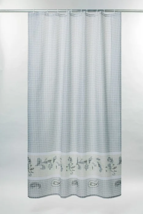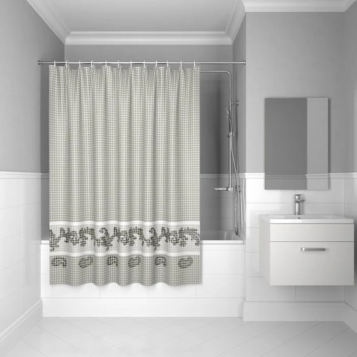 Штора для ванной комнаты, коллекция Basic; 100% Полиэстер; плотность - 90 гр/м2; размер - 200*180 см. Водоотталкивающее покрытие; 12 колец C-type. Материал люверсов - Пластик прозрачный. Упаковка - ПВХ пакет.