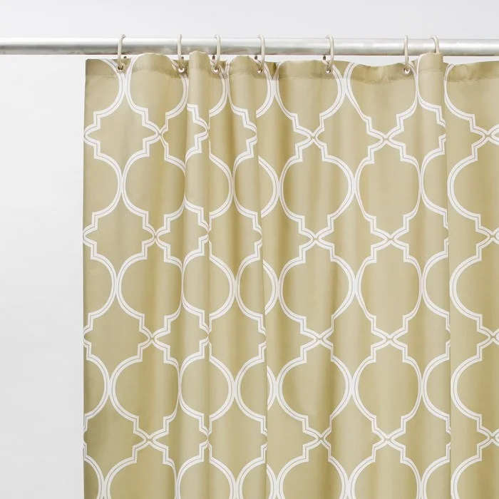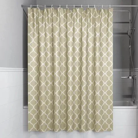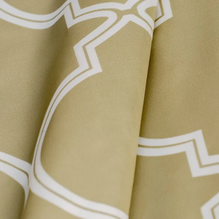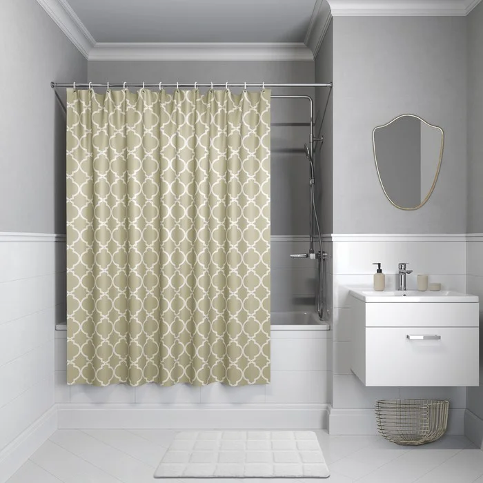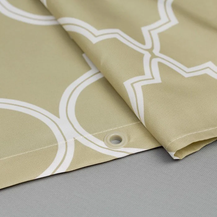 100% Полиэстер, плотность - 100 г/м2, размер 200-180 cм, пропитка waterproof PA, пластиковые люверсы, цвет бежевый, 12 колец в комплекте, цвет бежевый, форма "С". Упаковка ПВХ пакет.