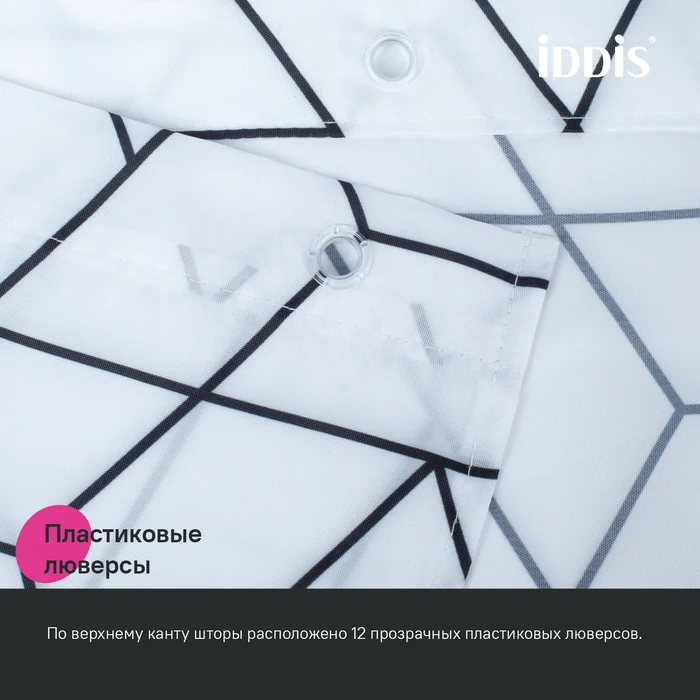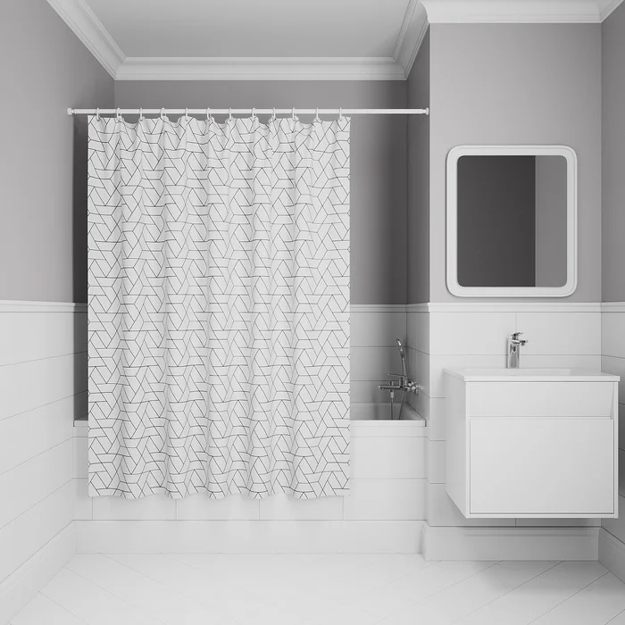 Текстильная Штора для ванны белого цвета с черным геометричным принтом.
