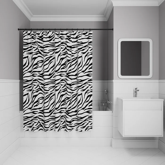 Текстильная Штора для ванны черно-белого цвета с анималистичным принтом в виде расцветки зебры.