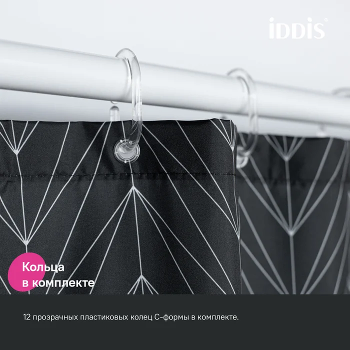 Текстильная Штора для ванны черного цвета с белым геометричным принтом.