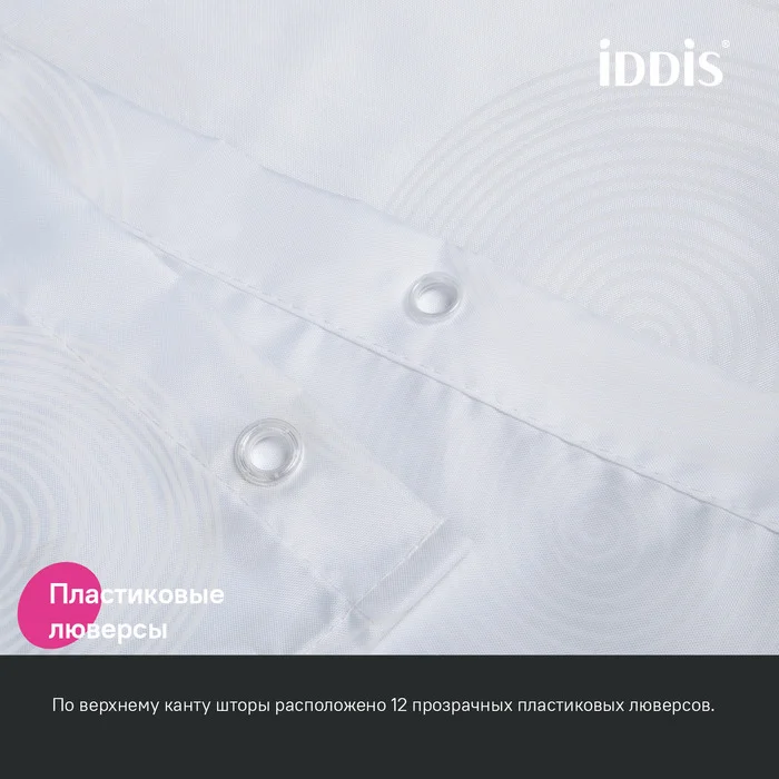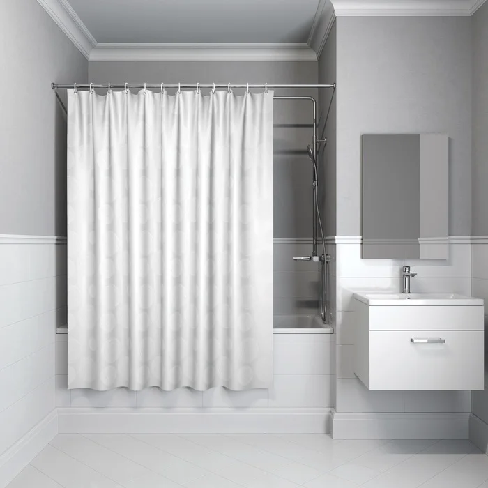 Текстильная Штора для ванны белого цвета с деликатным рисунком в виде кругов выглядит элегантно и подойдет к интерьеру в любом стиле и цветовой гамме.