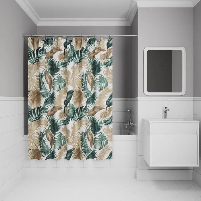 Текстильная Штора для ванны с принтом из тропических листьев в природных бежево-зеленых тонах.