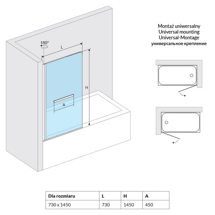Устанавливается на любые прямоугольные ванны с ровными горизонтальными бортами.