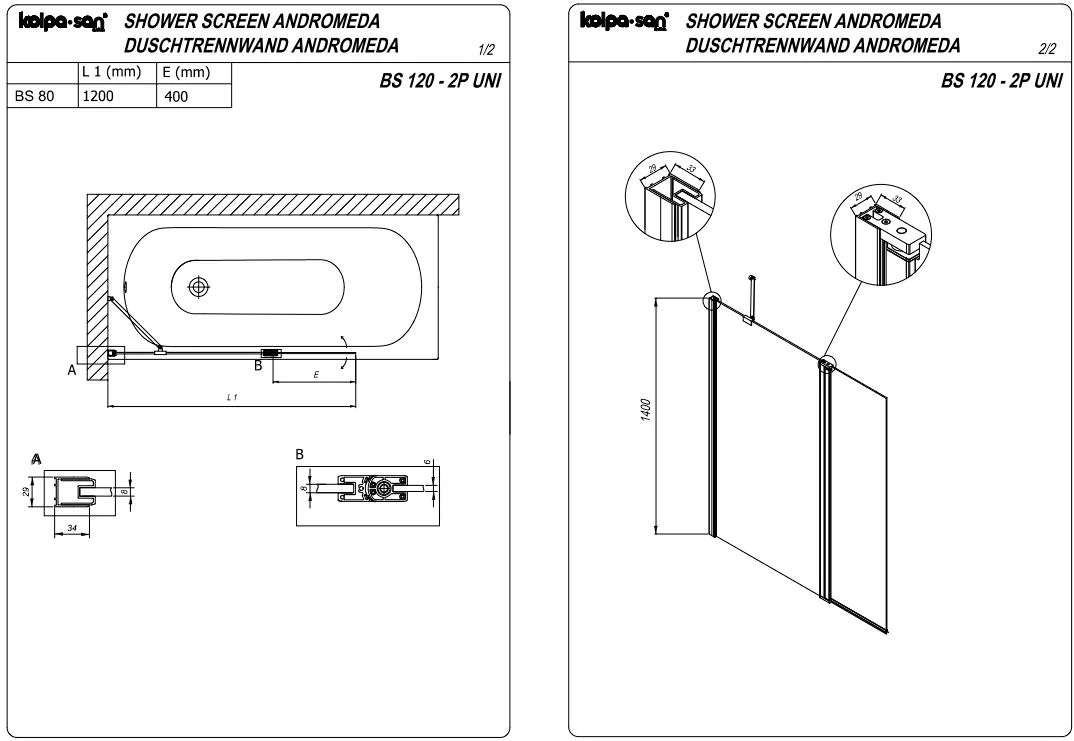 Шторка на ванну Kolpa-San ANDROMEDA BS 120 профиль черный, стекло прозрачное 517780