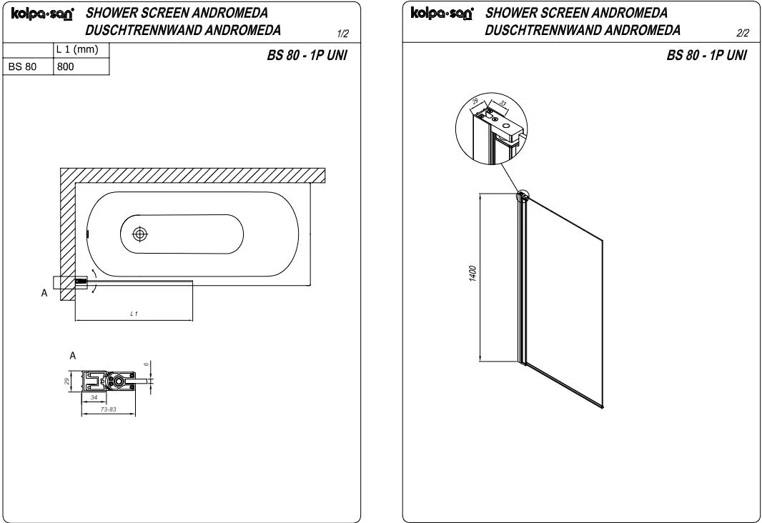 Шторка на ванну Kolpa-San ANDROMEDA BS 80 профиль черный, стекло прозрачное 517760