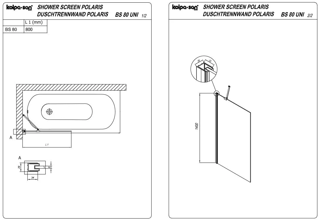 Шторка на ванну Kolpa-San POLARIS BS 80 профиль черный, стекло прозрачное 517740