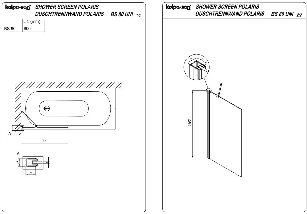 Шторка на ванну Kolpa-San POLARIS BS 80 профиль серебро, стекло прозрачное 517730