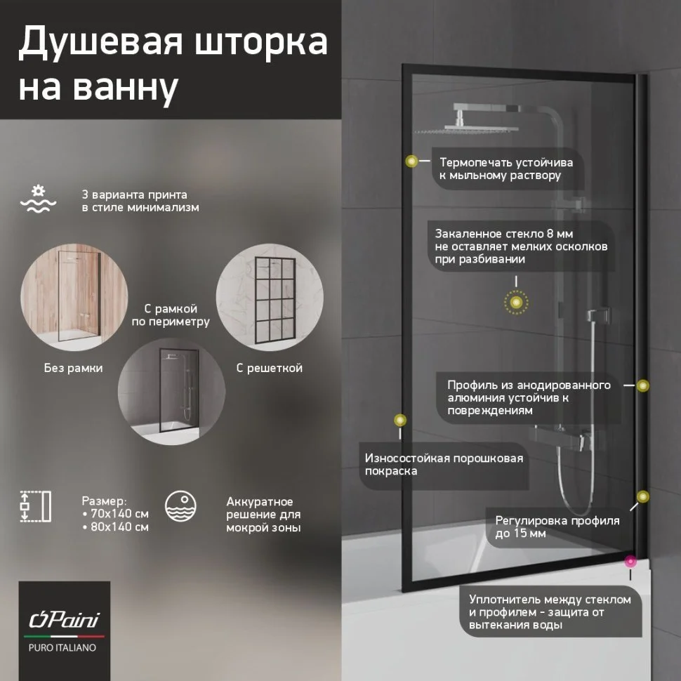 Шторка на ванну Paini Screen 70 см Paini-ScreenWT70C неподвижная, прозрачное, профиль черный