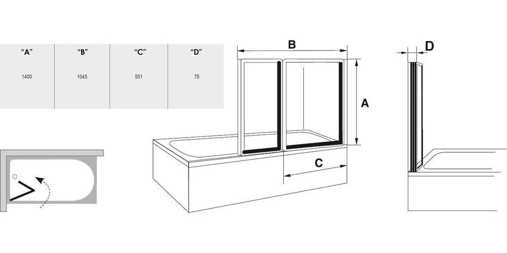 Стандартная высота шторы 1400 мм. Штора для ванны VS2 в сложенном виде имеет ширину 545 мм. Повернув VS2 на 180°, получите Л/П варианты входа. Возможно изготовление атипичной шторы для ванны.