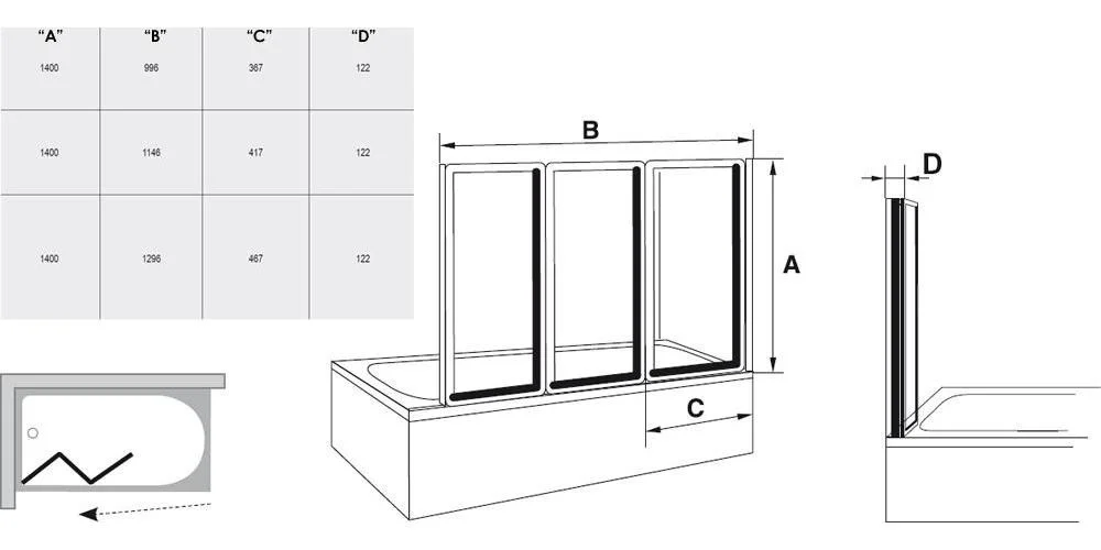 Размер: 129,6х140см. Шторка для ванны трехэлементная, складывающаяся.