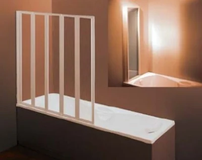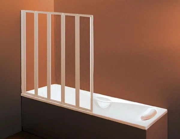 Штора состоит из пяти подвижных частей, которые полностью складываются вовнутрь ванны в т.н. «гармошку».