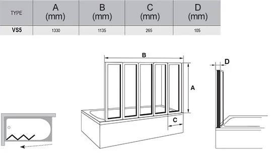 Стандартная высота шторы 1330 мм. Штора для ванны VS5 в сложенном виде имеет ширину 223 мм. Повернув VS5 на 180°, получите Л/П варианты входа.