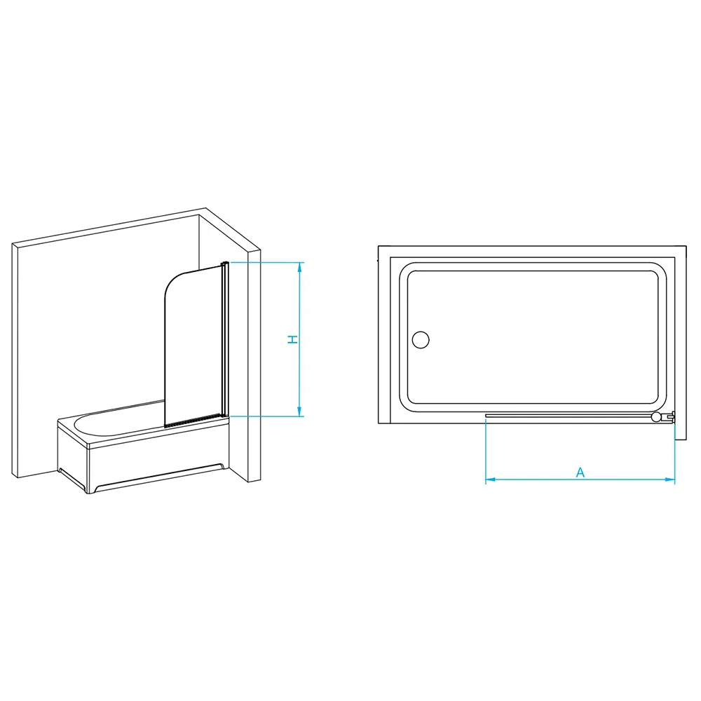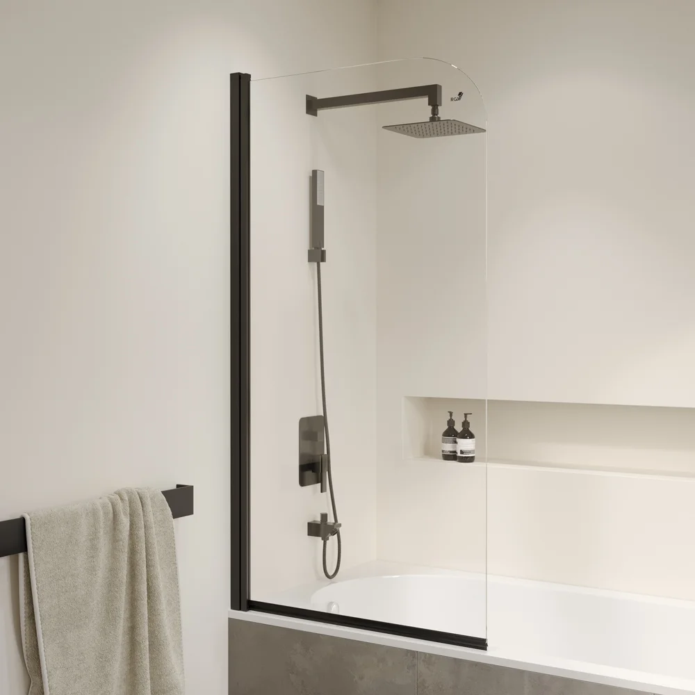 Профиль шторки окрашен в черный цвет, что придает ему стильный и современный внешний вид, что легко подойдет к любому дизайну ванной комнаты. Высота стеклянной шторки составляет 1500 мм, что позволяет использовать ее даже в очень высоких ванных.