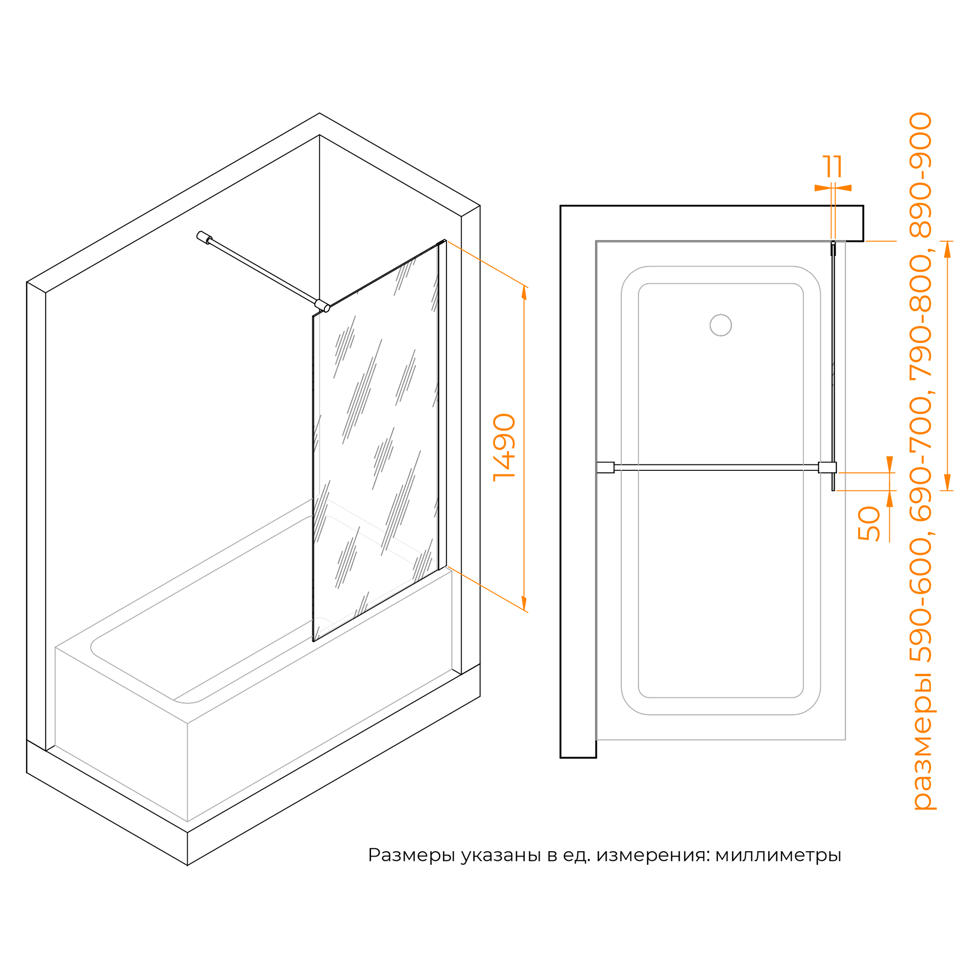Высота стеклянной шторки составляет 1490 мм, что идеально подходит для большинства стандартных ванных комнат. Это позволяет установить шторку на вашу ванну без необходимости заказывать индивидуальный размер.