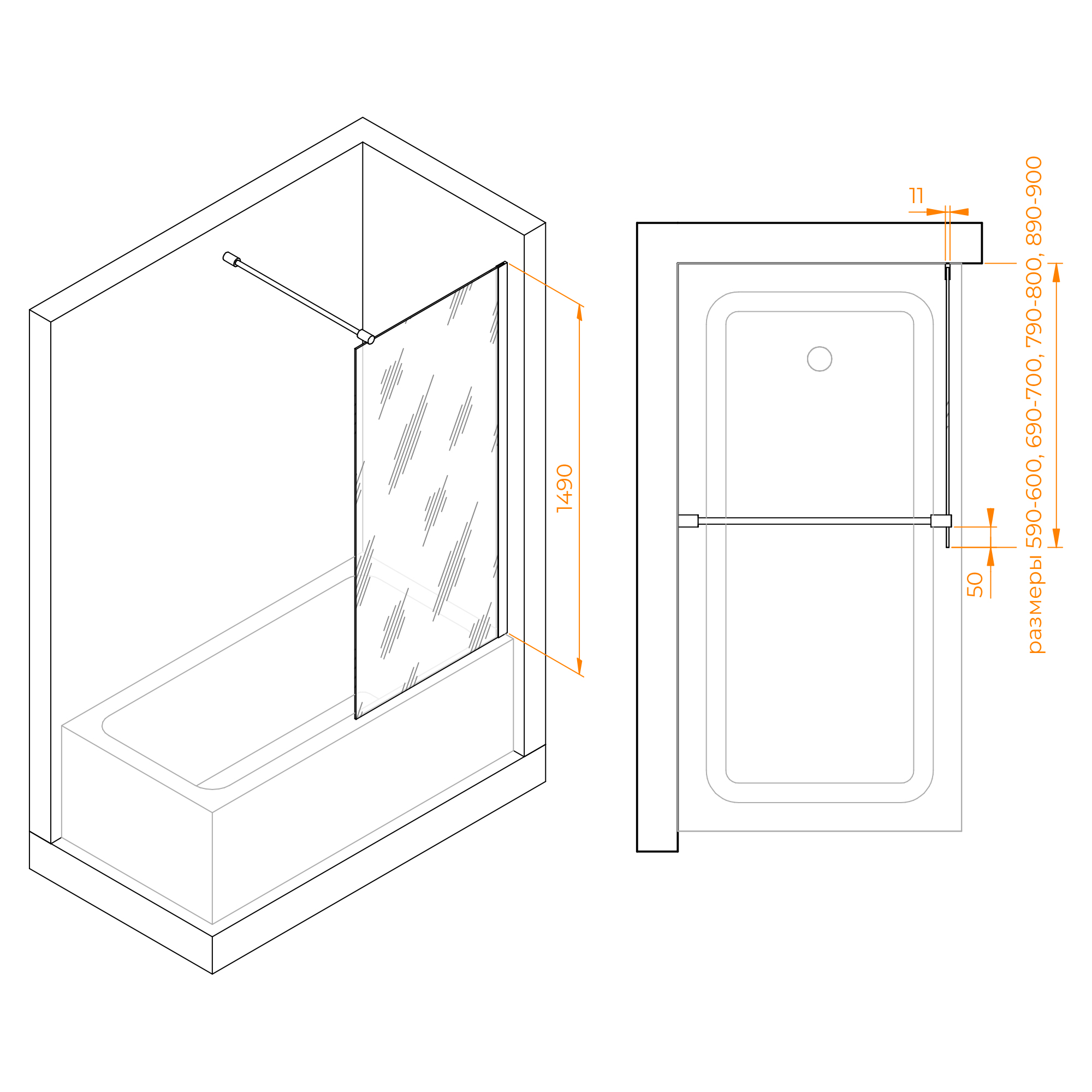 Высота стеклянной шторки 1490 мм, что позволяет использовать ее в большинстве стандартных ванных комнат. Конструкция створки шторки неподвижная, что обеспечивает максимальную надежность и удобство при ее использовании.
