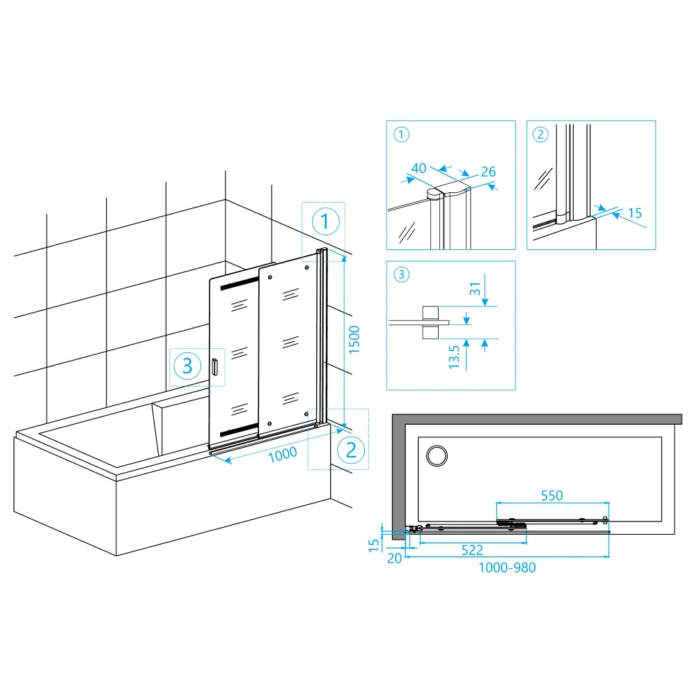Высота стеклянной шторки составляет 1500 мм, что вполне достаточно для большинства ванных комнат. Ресурс эксплуатации составляет 15 лет, что гарантирует долгий период бесперебойной работы шторки.