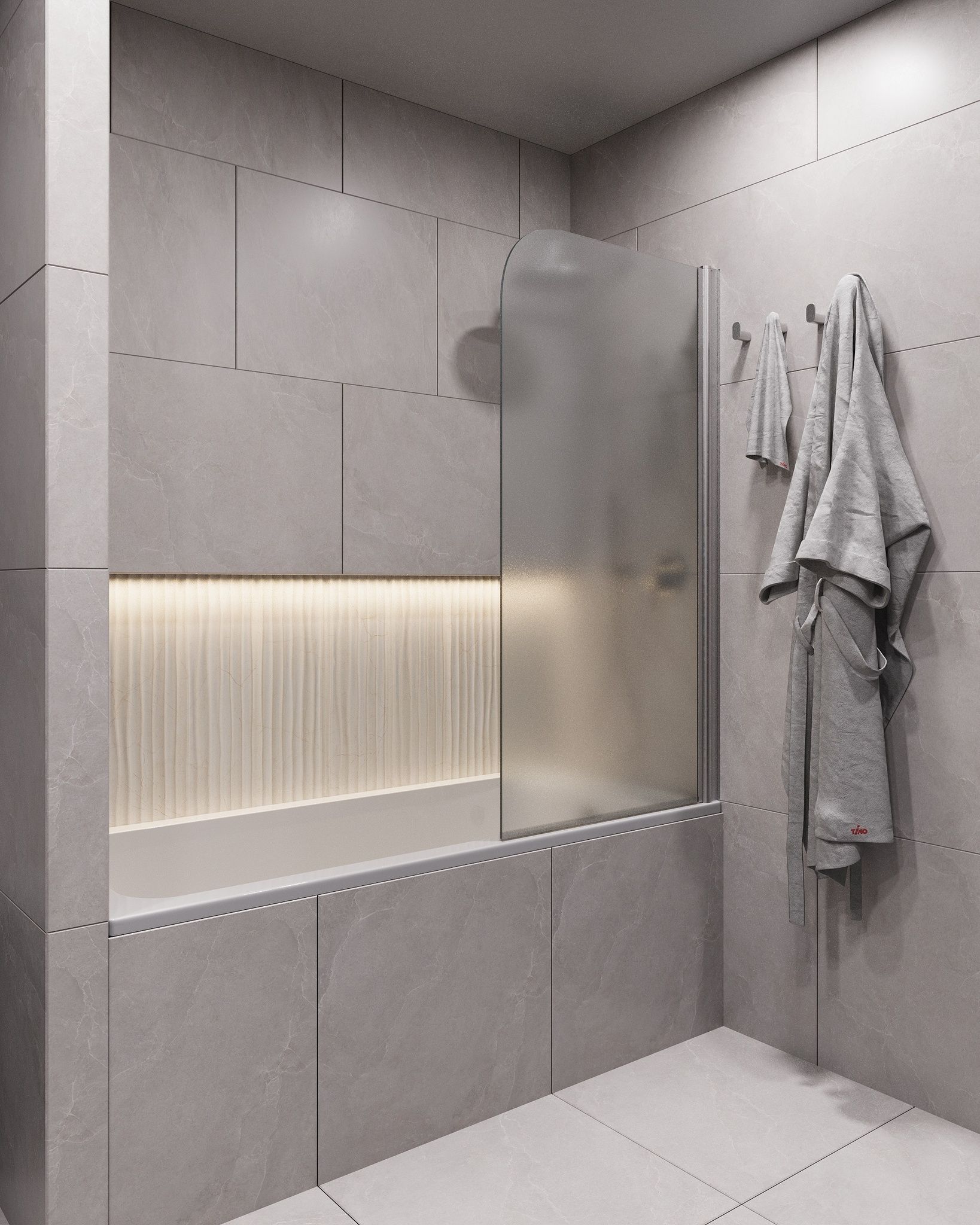 стекло матовое, толщина 6 мм 1400х740 мм - 1 шт, Монопетля, цвет Хром матовый - 1 шт, Комплект крепежа - 1 шт, Уплотнитель – 1 шт, Инструкция по монтажу - 1 шт