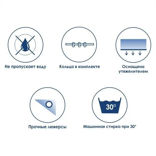 Назначение: Шторка для ванной. Материал: Полиэстер.Монтаж: Пластиковые люверсы. Описание: Размер 1800 х 2000 мм, водоотталкивающая пропитка. Низ шторки оснащен утяжелителем, в комплект входят ластиковые кольца белого цвета, 12 шт. Плотность шторки 90 г/м² Дополнительно: Шторки можно стирать в стиральной машине. Температура не должна превышать 40 градусов.