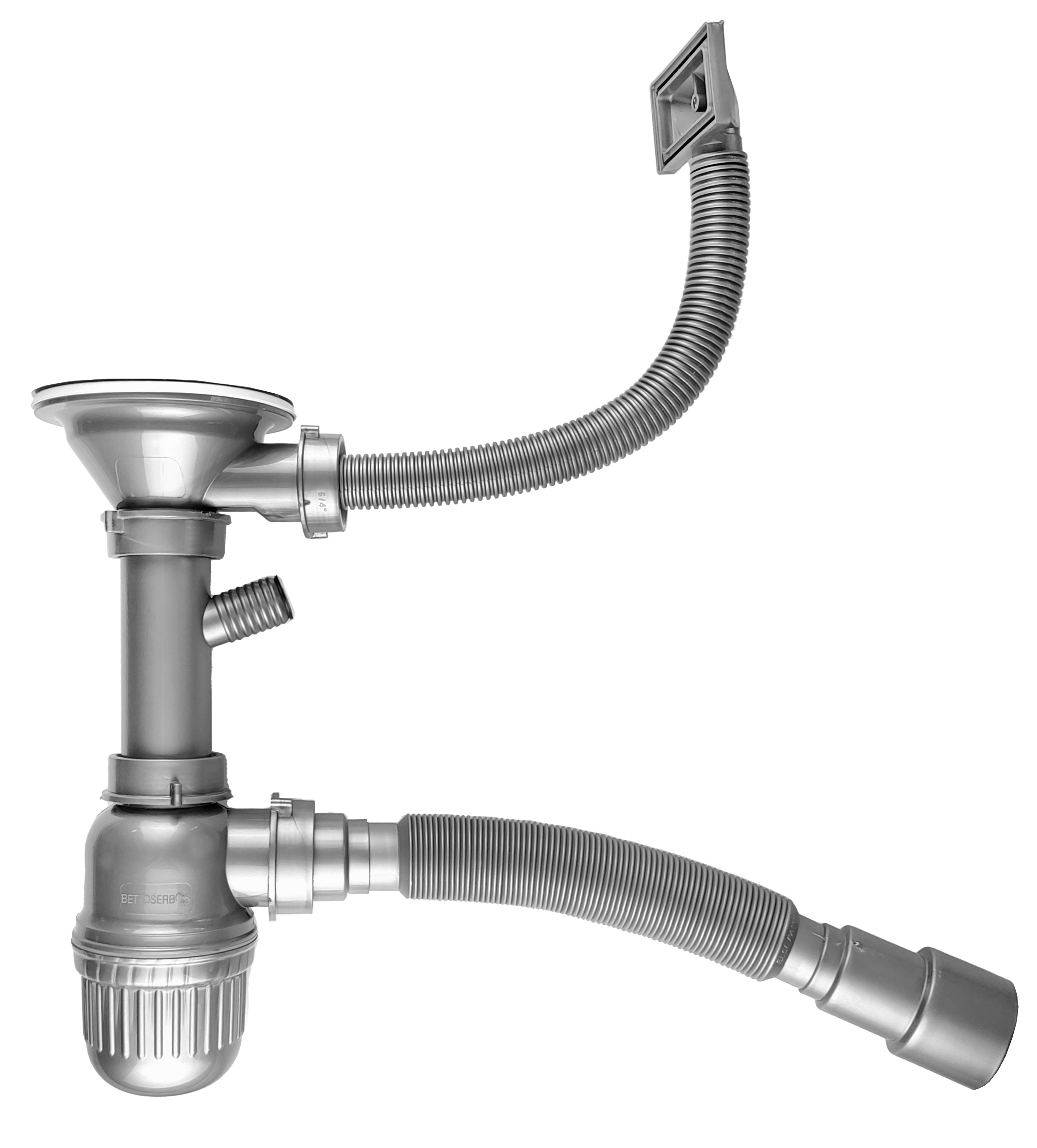 Сифон для кухонной мойки. Габариты: 260х114х408/930 Регулируемая высота: 4,5 см Диаметр слива: 90 мм Диаметр чаши: 114 мм Диаметр фильтр-пробки: 80 мм Подключение к канализации: 40/50 мм В комплекте универльсаоный крепеж (евроболт 40мм для монтажа чаши, винты 15мм и 25мм для монтажа перелива) для монтажа как на мойку из нерж. стали, так и искусственного камня; 2 вида переливов в комплекте (40х70 мм для нерж.стали и Ø25мм для искусственного камня) Отвод для посудомоечной машины