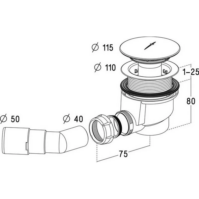 Сифон для душевых поддонов со сливным отверстием диаметром 90 мм, с хромированной крышкой диаметром 115 мм. Угол 135 градусов с возможностью регулирования направления сливной трубы