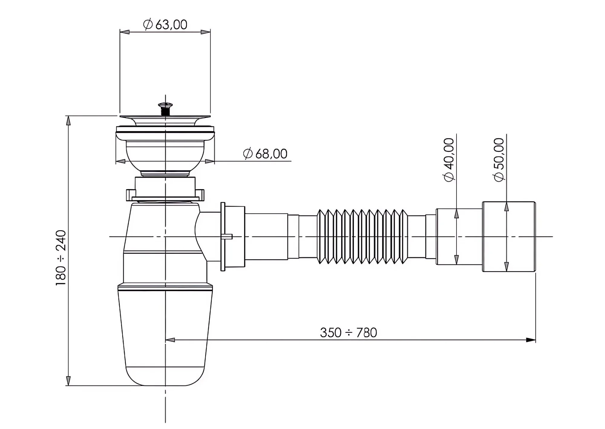 Сифон для раковины/умывальника. Габариты сифона: 180x68x385/765; Регулируемая высота: 6 см Диаметр слива: 32 мм Подключение к канализации: 40/50 мм Тип сифона: бутылочный Решётка из нержавеющей стали
