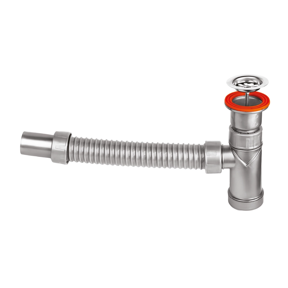 Сифон под раковину изготовлен из высокопрочного пластика, который устойчив к высоким и низким температурам, а также не боится агрессивной бытовой химии. Сифон оснащен гидрозатвором высотой 34мм, поэтому ваш дом будет надежно защищен от неприятных запахов. Сифон оснащен гибкой самоочищающейся гофрированной трубой - SelfCleaning. 100% гарантия от протечек в местах гибких соединений.