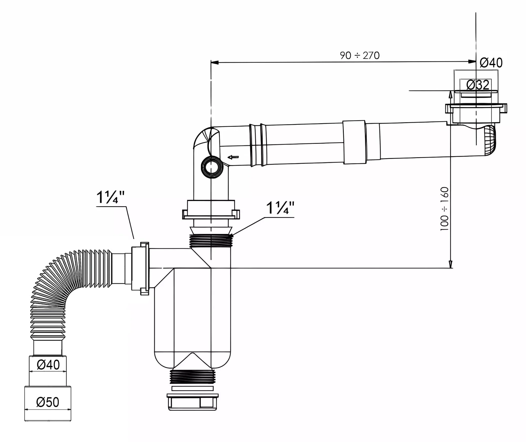 Сифон под раковину, экономящий пространство под мойкой. С телескопической горизонтальной регулировкой длины трубы отвода; с выпуском под стиральную/посудомоечную машину; под выпуск/донный клапан диаметром 32мм Регулируемая длина телескопической трубы 90-270мм Диаметр слива: 32мм Подключение к канализации: 40/50 мм через гибкое гофрированное соединение Тип сифона: бутылочный