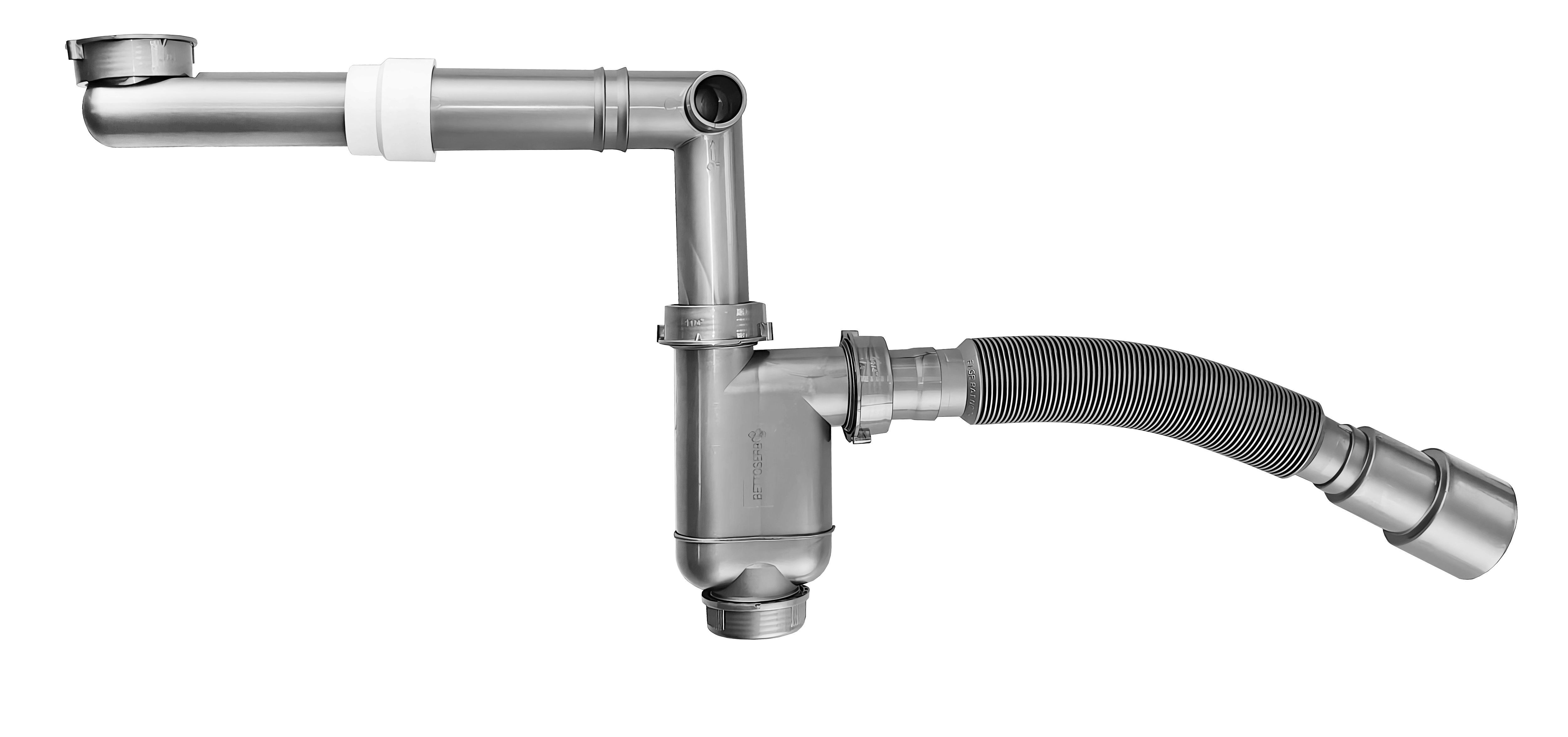 Сифон под раковину, экономящий пространство под мойкой. С телескопической горизонтальной регулировкой длины трубы отвода; с выпуском под стиральную/посудомоечную машину; под выпуск/донный клапан диаметром 32мм Регулируемая длина телескопической трубы 90-270мм Диаметр слива: 32мм Подключение к канализации: 40/50 мм через гибкое гофрированное соединение Тип сифона: бутылочный