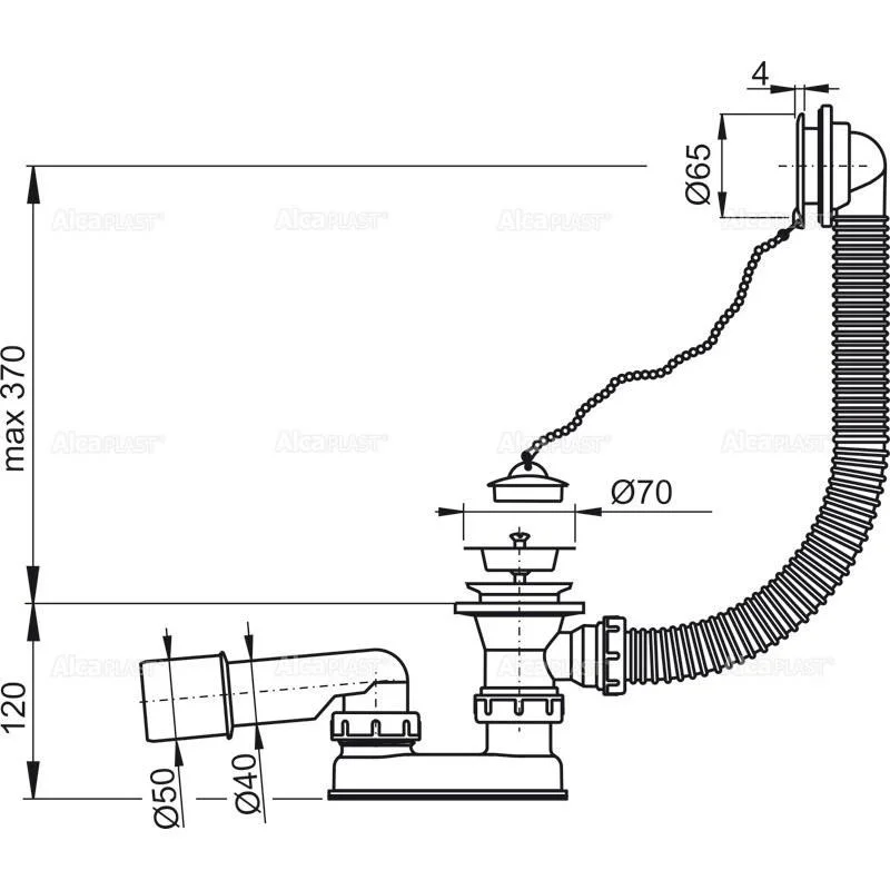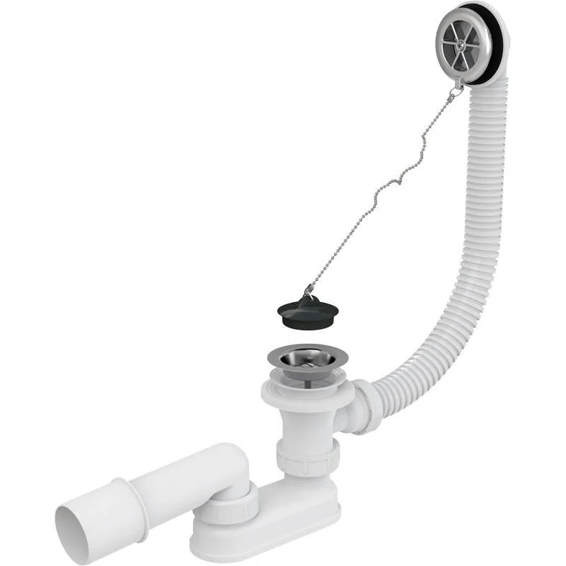 Корпус сифона с системой перелива. Хромированная пластиковая решетка перелива. Пробка из ПВХ на цепочке. Хромированная решетка слива из нержавеющей стали. Гидрозатвор сифона из полипропилена, сваренный ультразвуковым методом, устойчив к термическим и хими