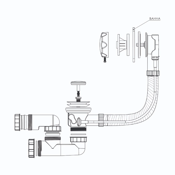 Оснащен механизмом закрытия из полиамида, который обеспечивает комфортную работу сифона. Этот механизм позволяет открывать и закрывать слив ванны с легкостью, обеспечивая плавную и надежную работу сифона.