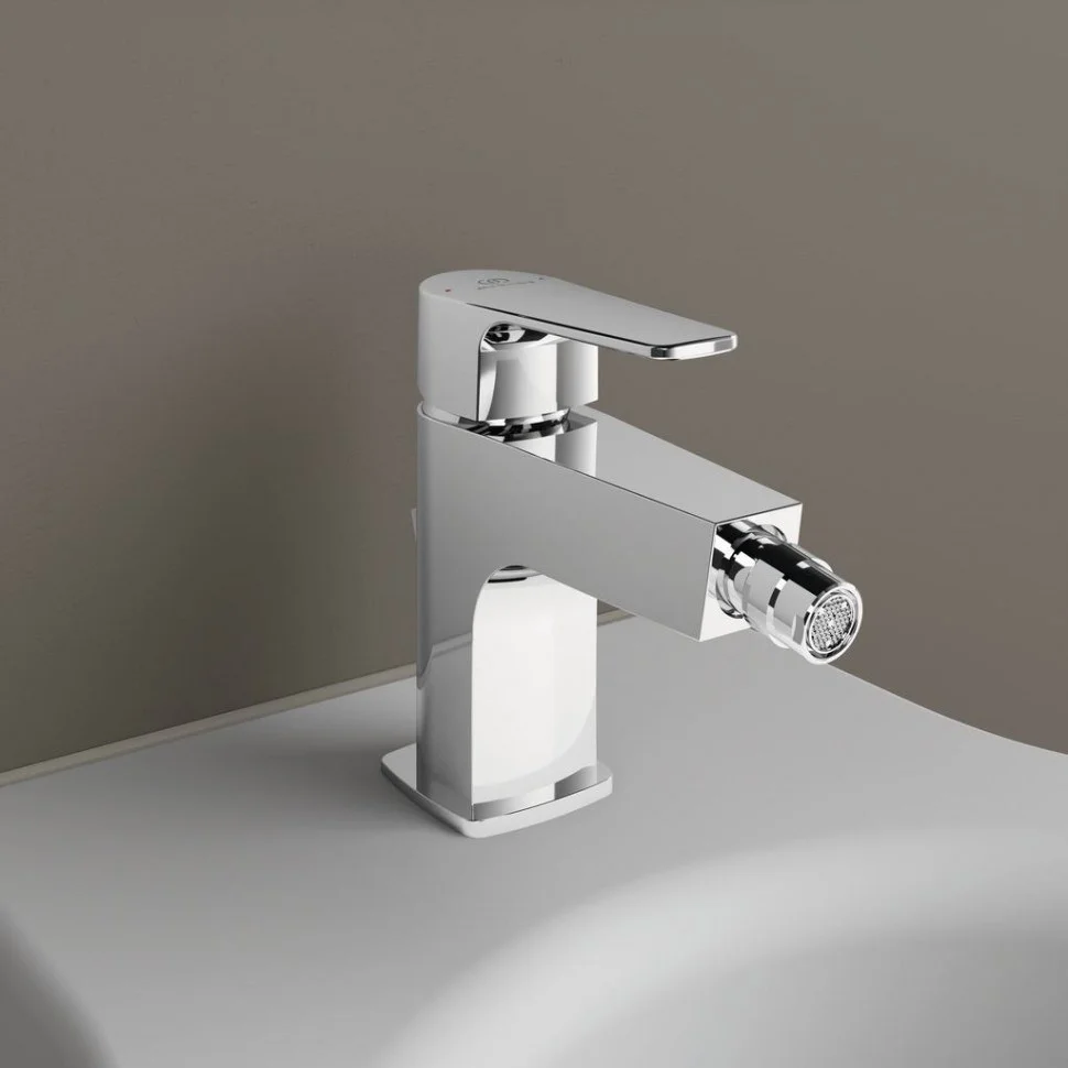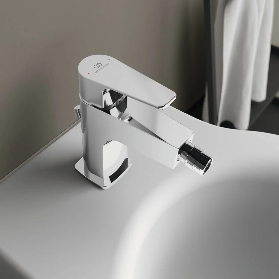 CERAFINE D Однорукоятковый смеситель для биде, картридж 28 мм FirmaFlow с функцией HWTC (ограничение максимальной температуры горячей воды), гибкая подводка G3/8’’, система монтажа EASY-FIX (облегченный монтаж), аэратор на шаровом шарнире (поворотный) с ограничением потока на 5 л/мин., металлическая рукоятка с индикаторами горячей / холодной воды, металлический донный клапана