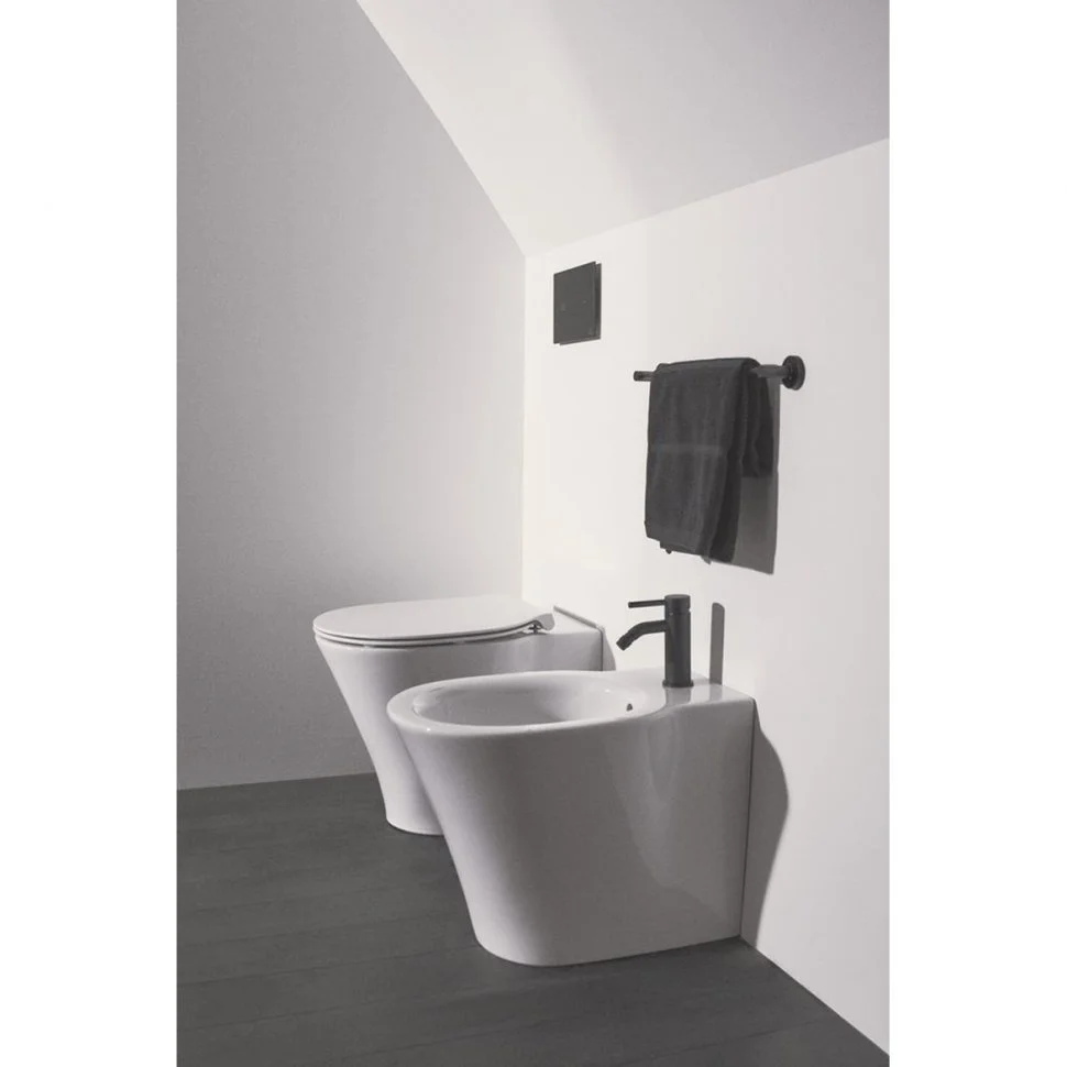 CERALINE Однорукоятковый смеситель для биде, картридж 28 мм FirmaFlow с функцией HWTC (ограничение максимальной температуры горячей воды), гибкая подводка G3/8", система монтажа EASY-FIX (облегченный монтаж), аэратор Perlator на шаровом шарнире (поворотный) с ограничением потока на 5 л/мин., металлическая рукоятка с индикаторами горячей / холодной воды, металлический донный клапан