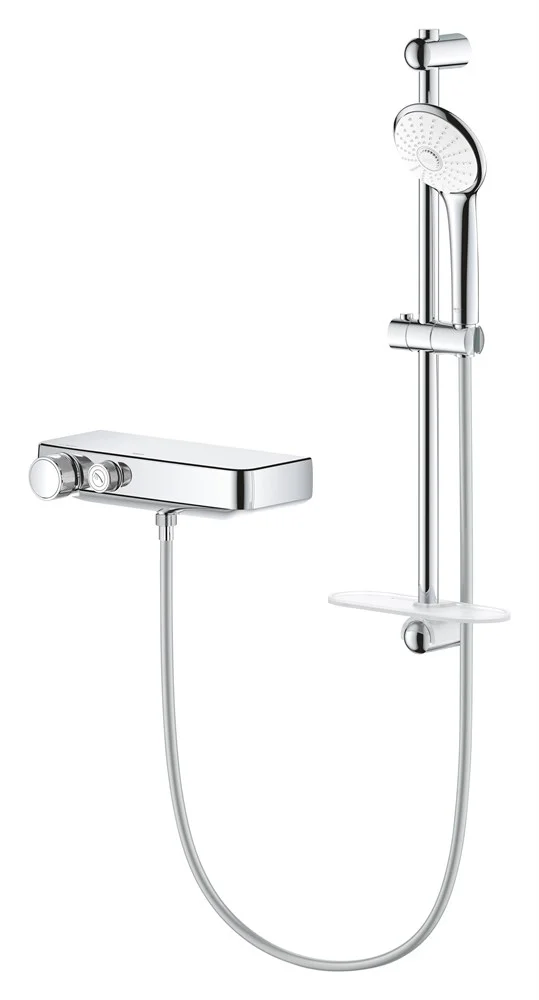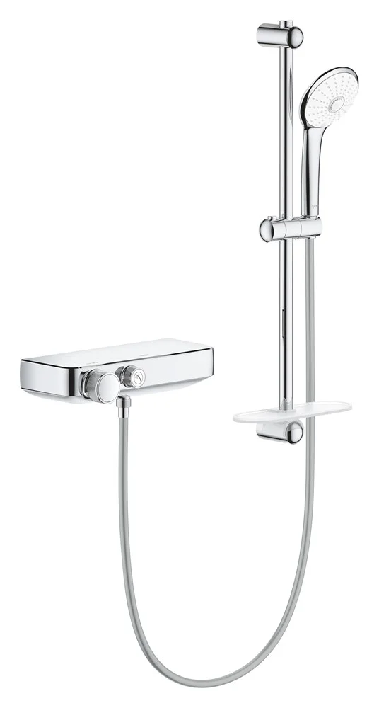 Термостатический смеситель поставляется в комплекте с душевым набором GROHE Euphoria 110 Massage, который включает в себя штангу длиной 600 мм, ручной душ диаметром 110 мм и душевой шланг с функцией антискручивания, длина которого составляет 1750 мм. Ручной душ предлагает три режима струи - GROHE Rain и экономичный GROHE SmartRain + восстанавливаюший и бодрящий режим Massage.