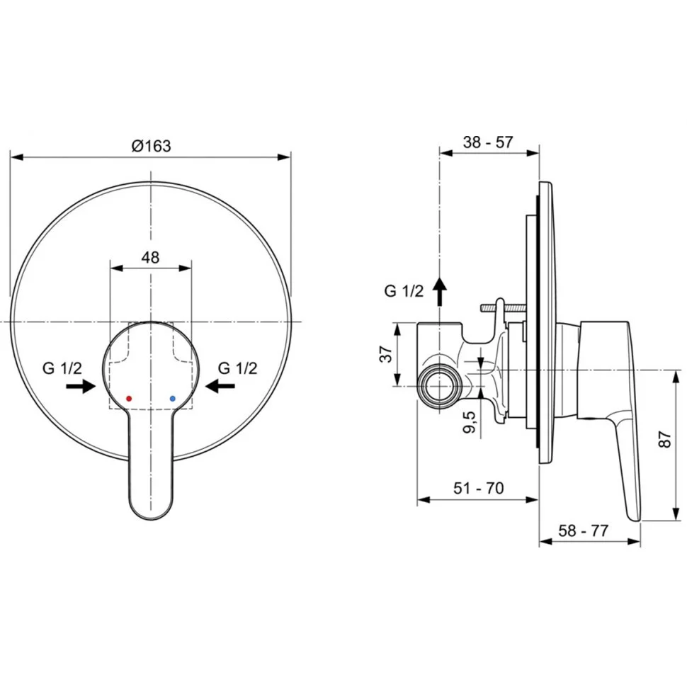 SESIA Встраиваемый смеситель для душа, комплект №1 A1300NU (встраиваемая часть) + комплект №2 (внешняя часть), картридж 47 мм с функцией HWTC, с функцией CLICK, металлическая рукоятка с индикаторами горячей / холодной воды